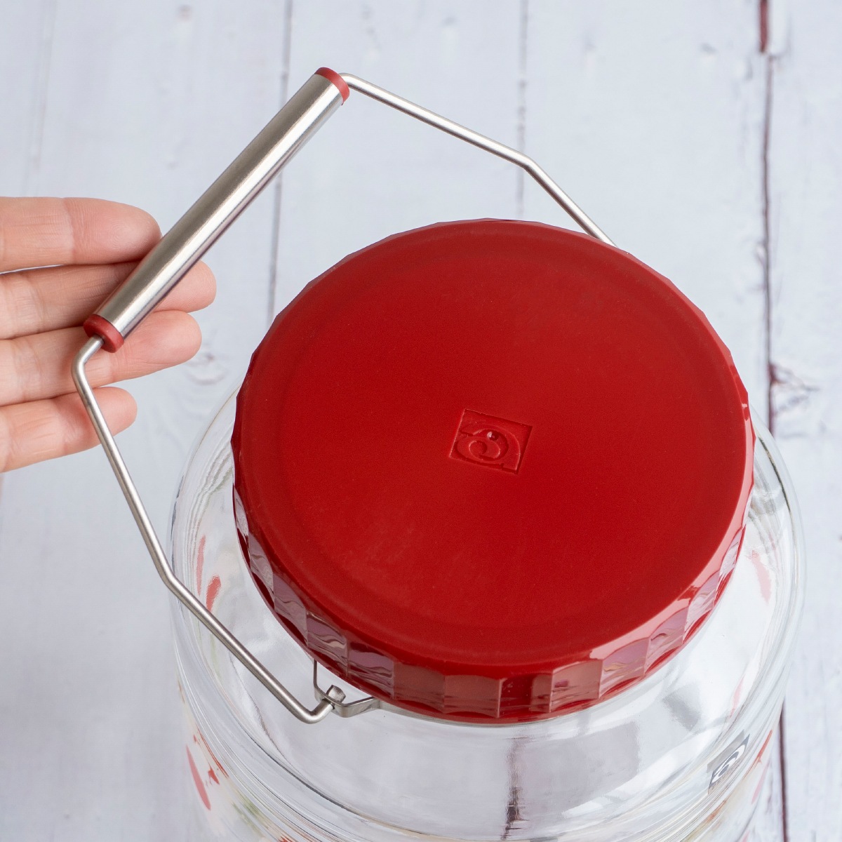 ステンレス製の持ち手がおしゃれな貯蔵びんです。