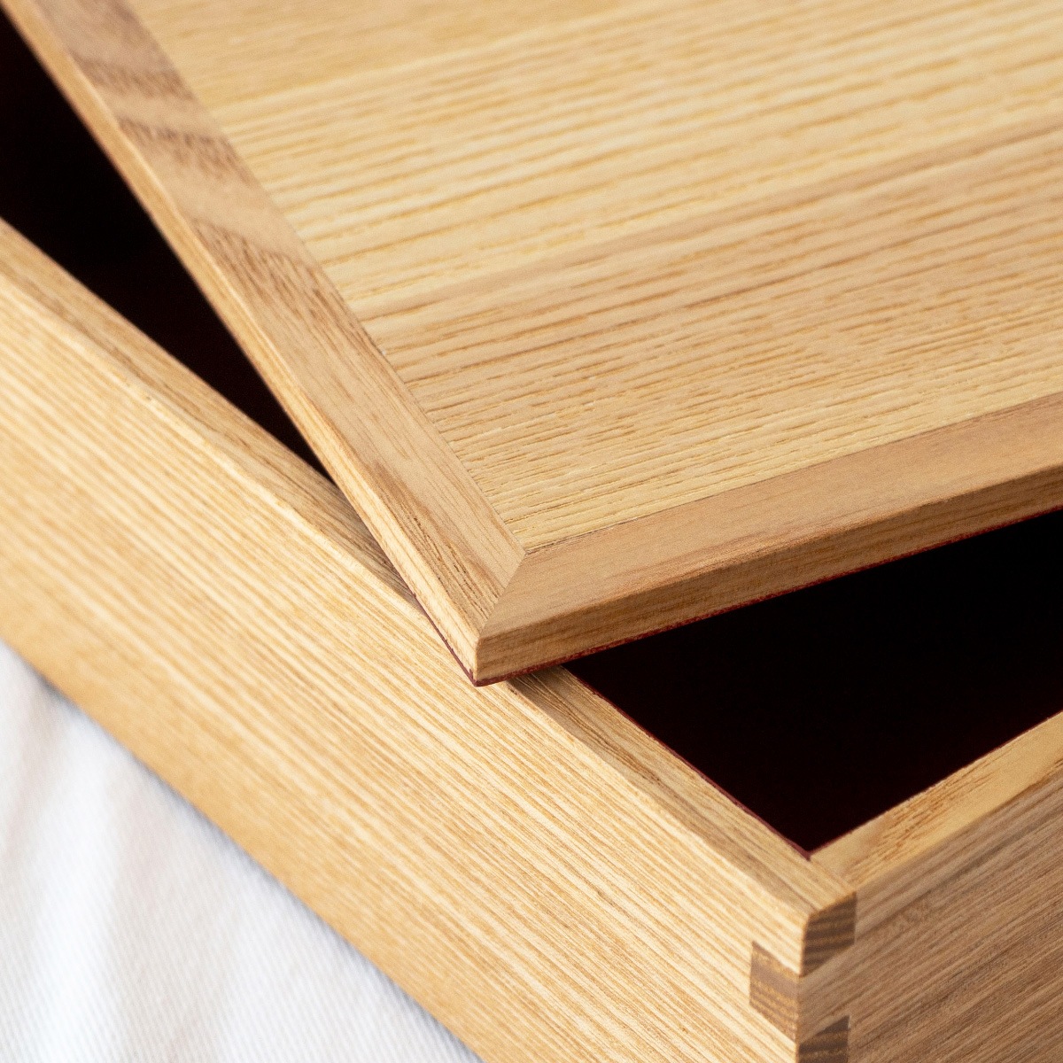 タモ材を白木塗で仕上げた6寸サイズの内朱二段重です。