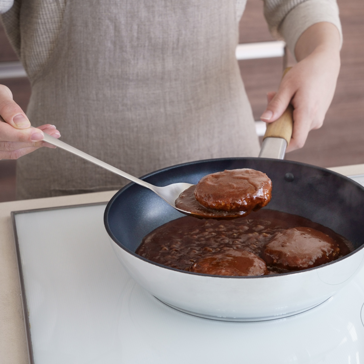 ハンバーグはソースごとすくうことができます。
