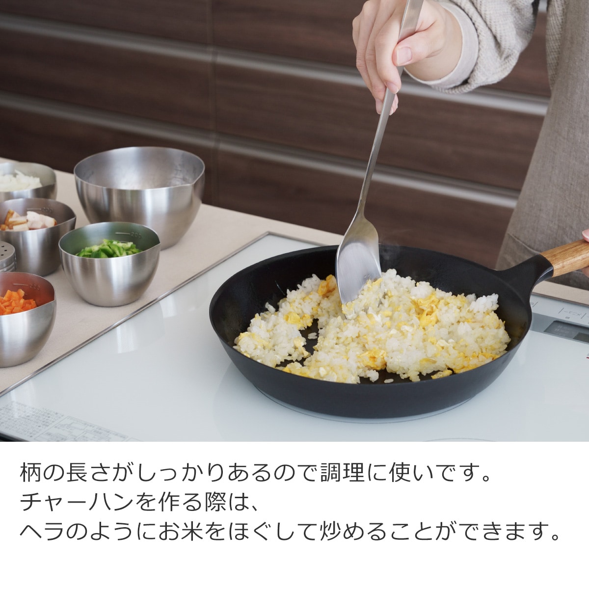 柄の長さがしっかりあるので調理に使いやすく、