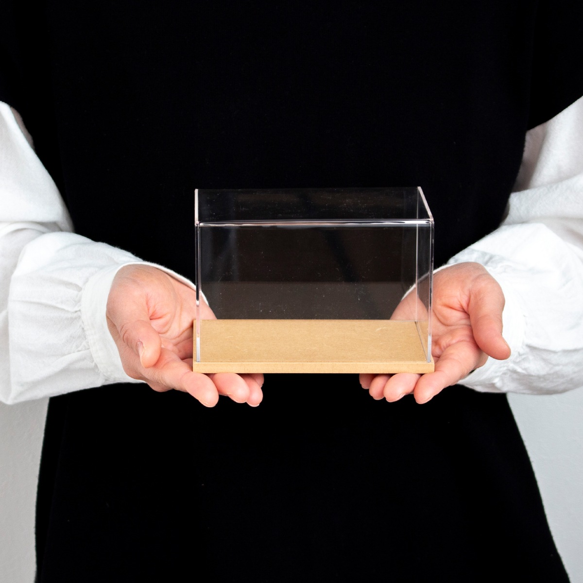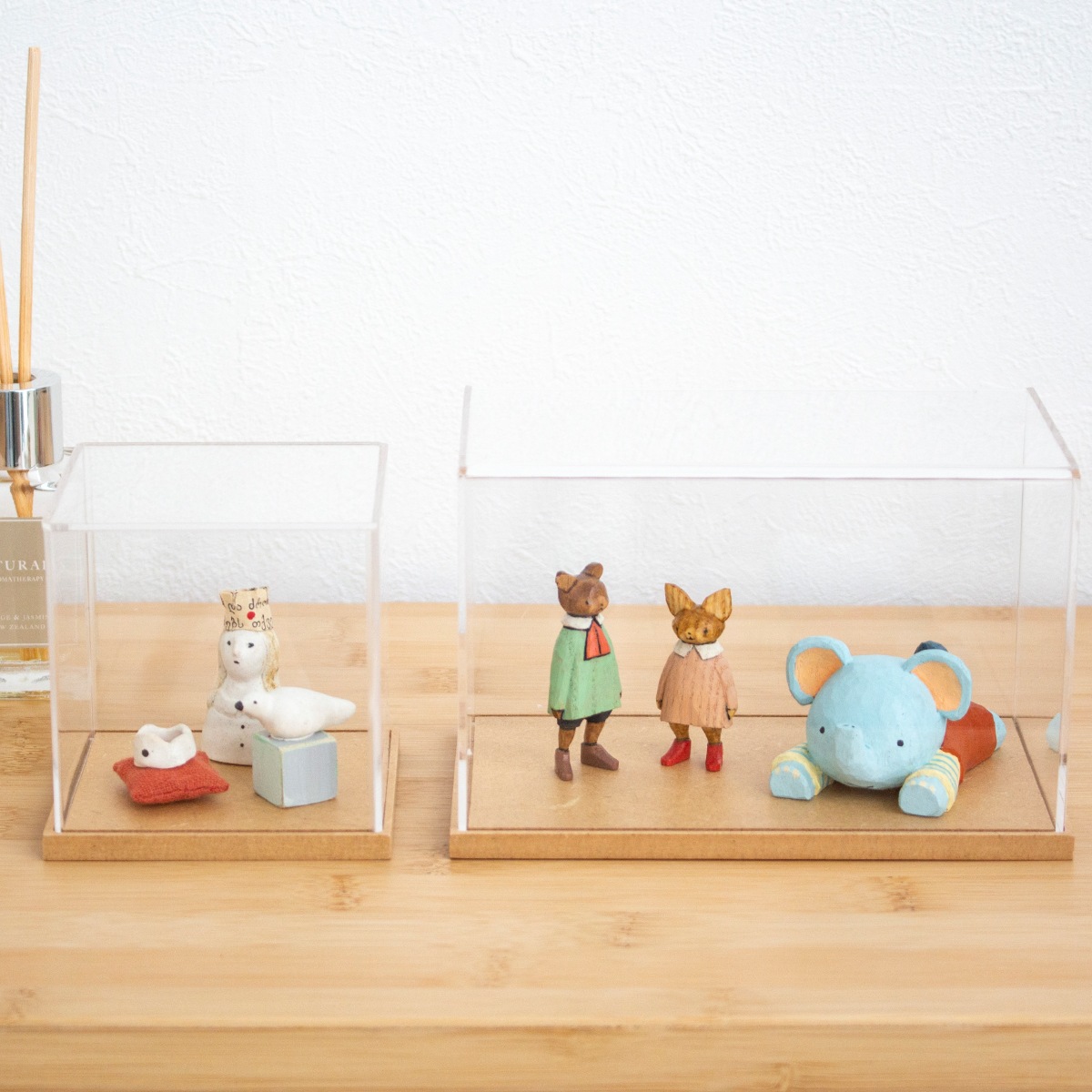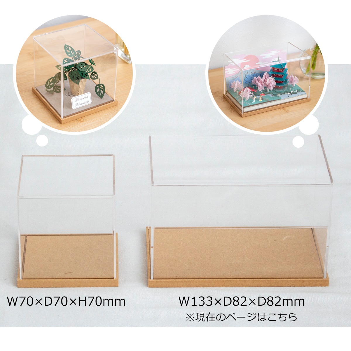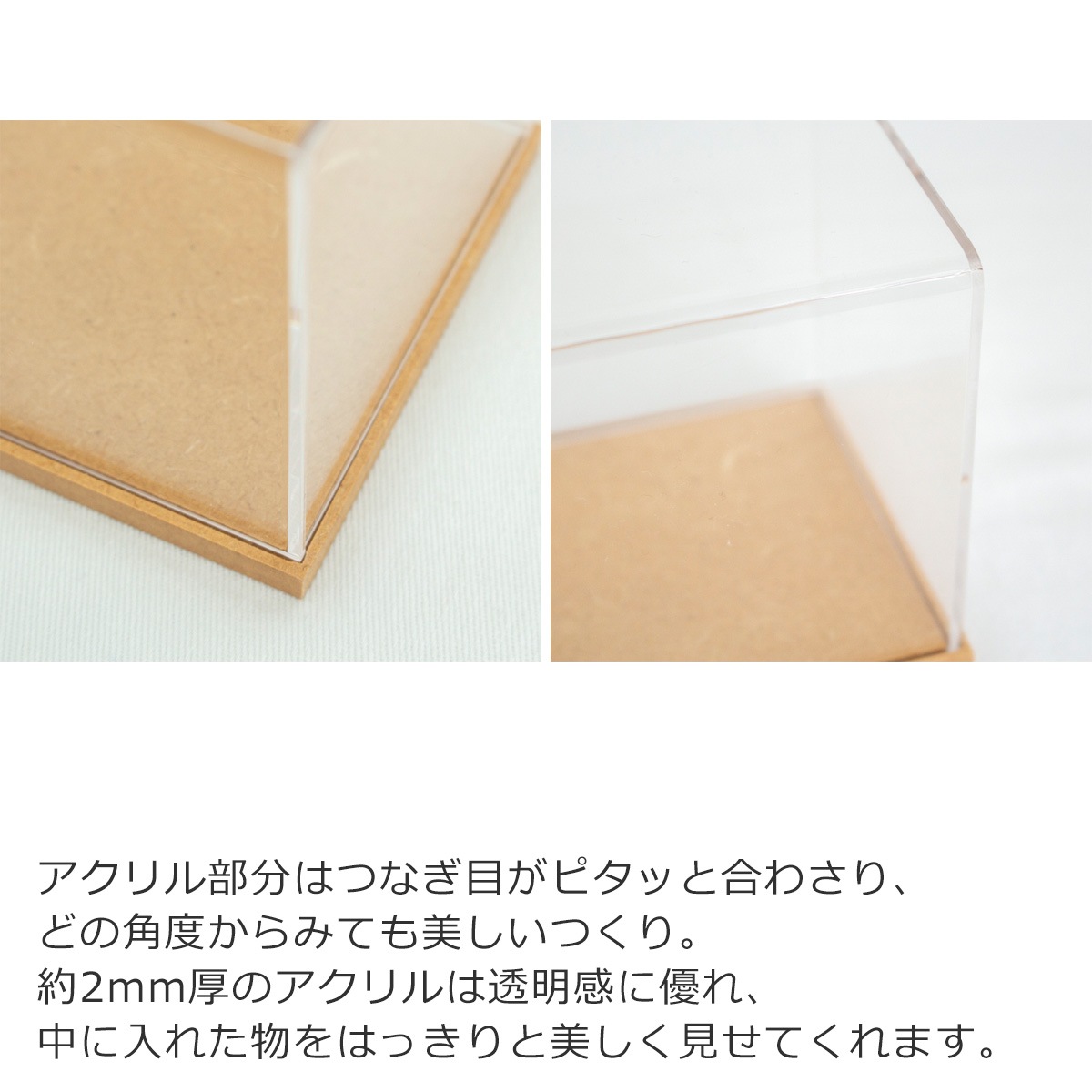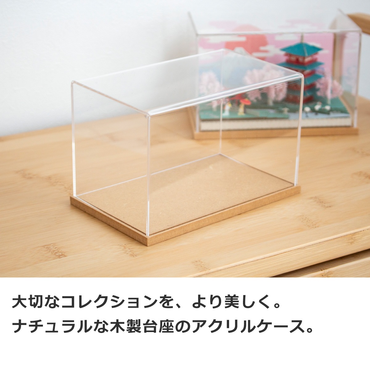 ナチュラルな木製台座のアクリルケース。