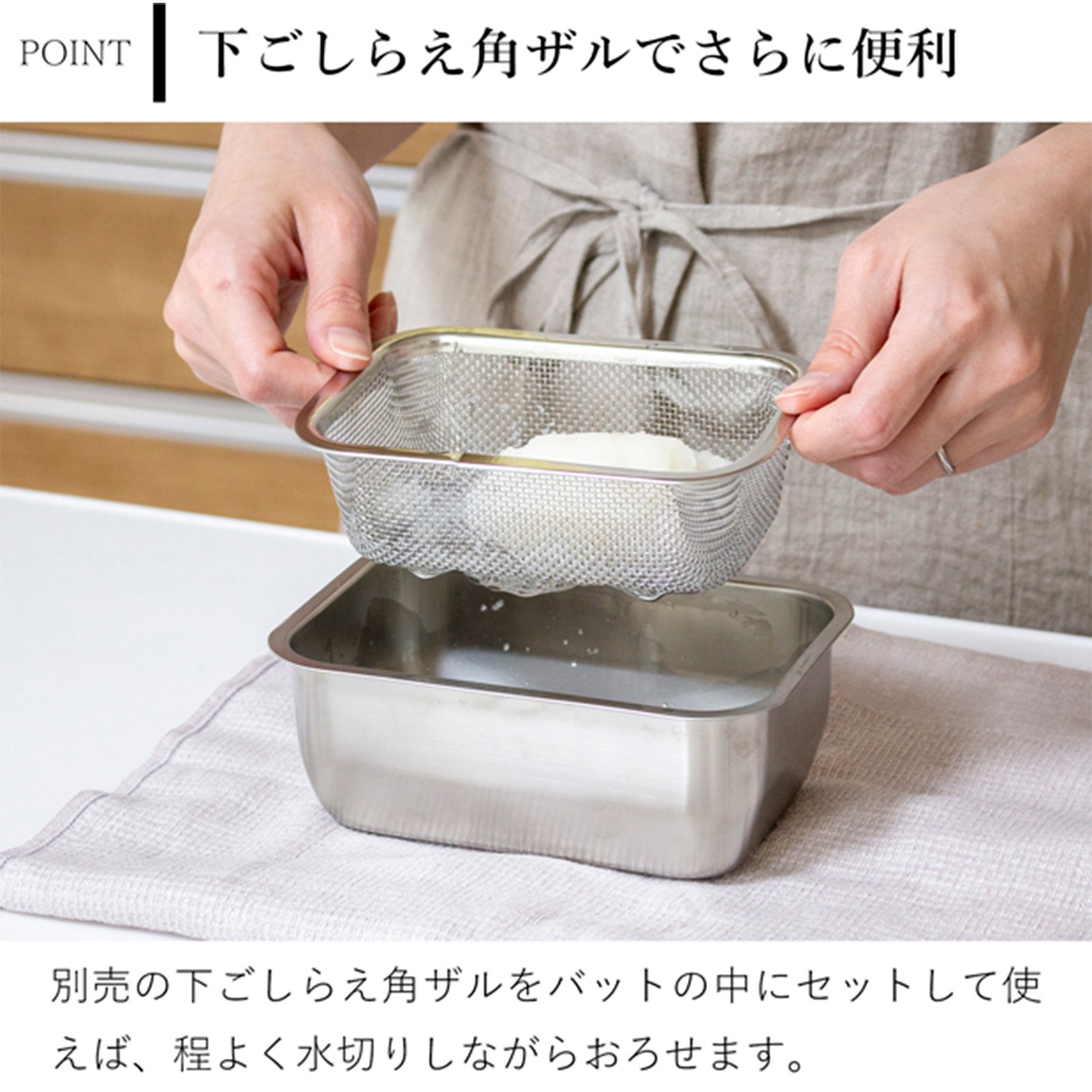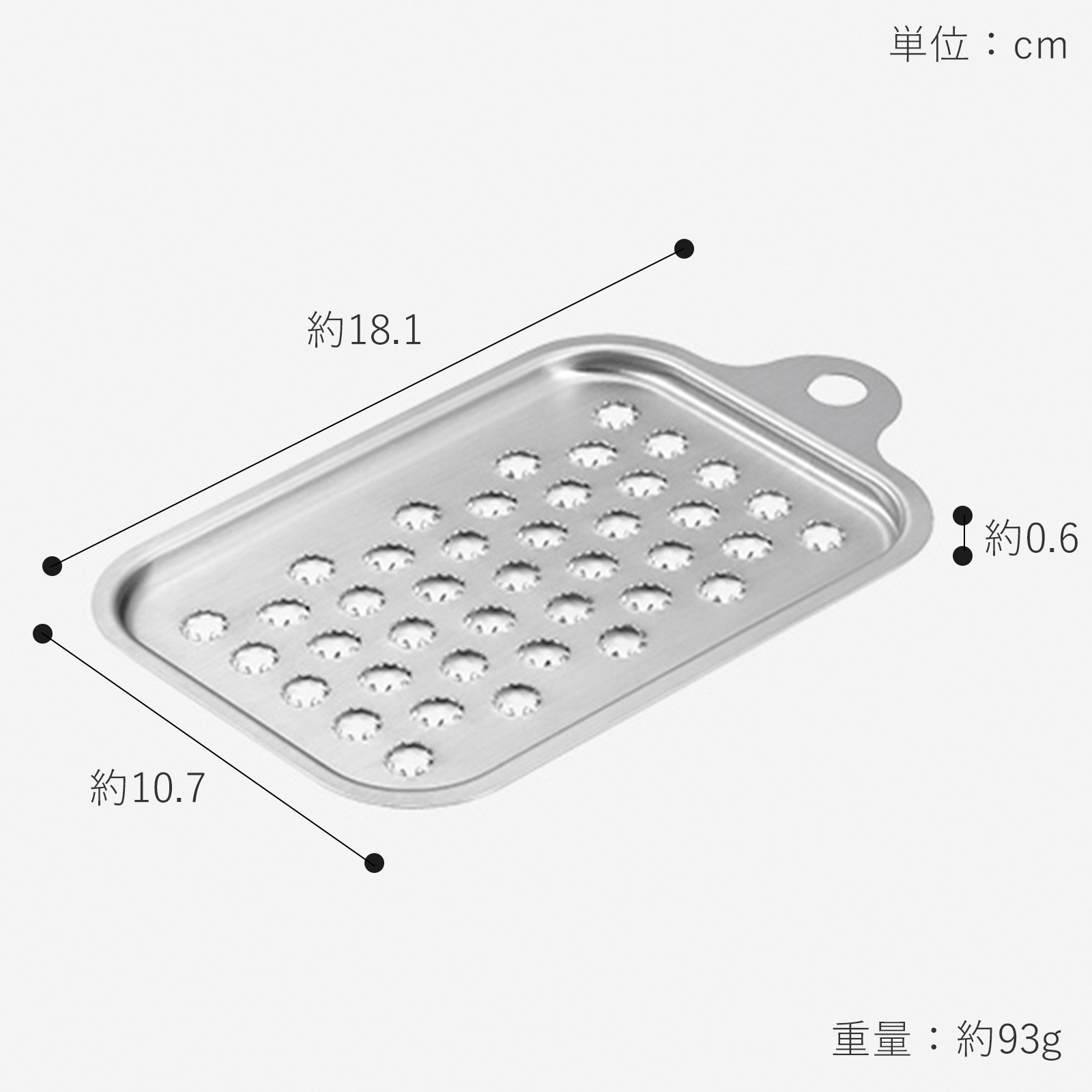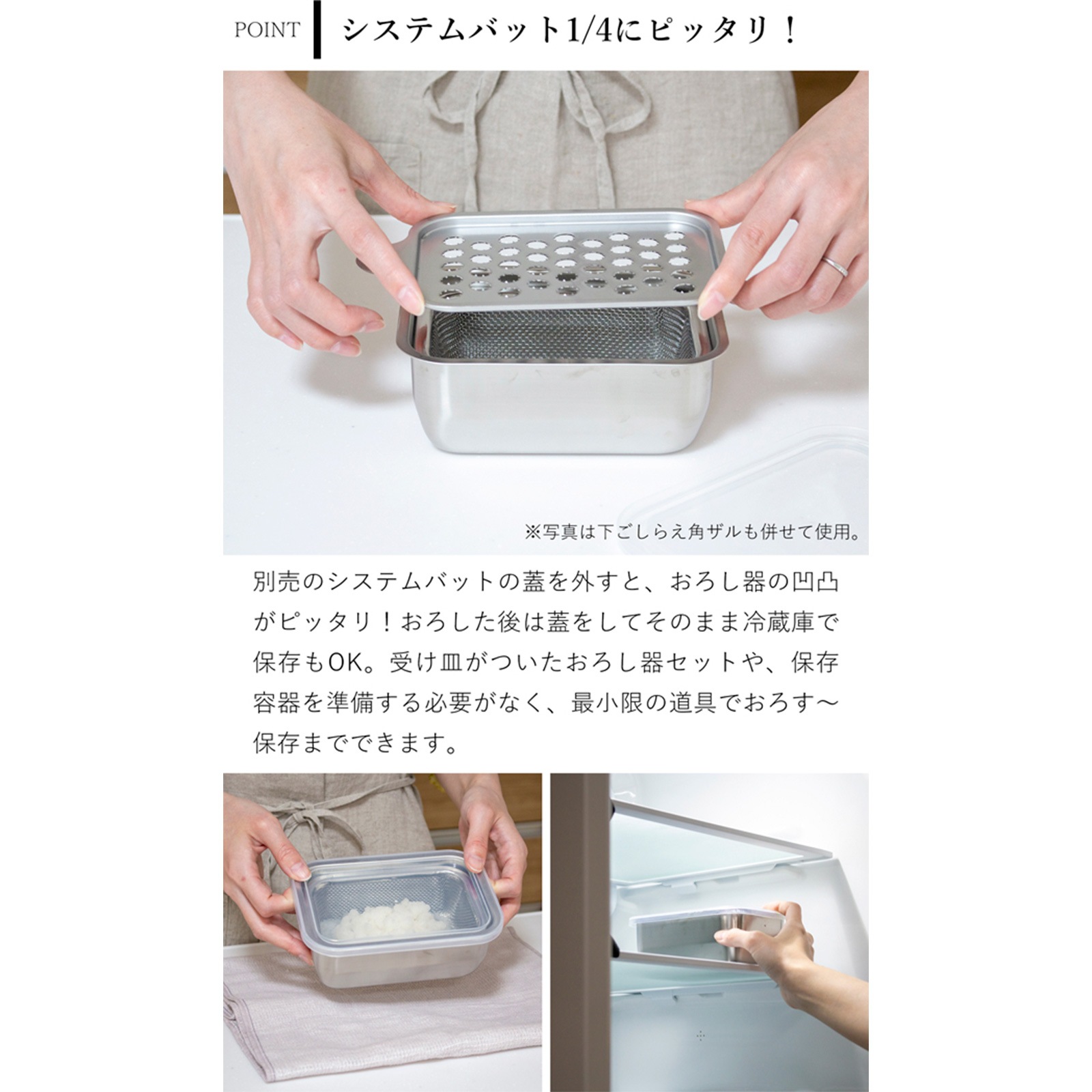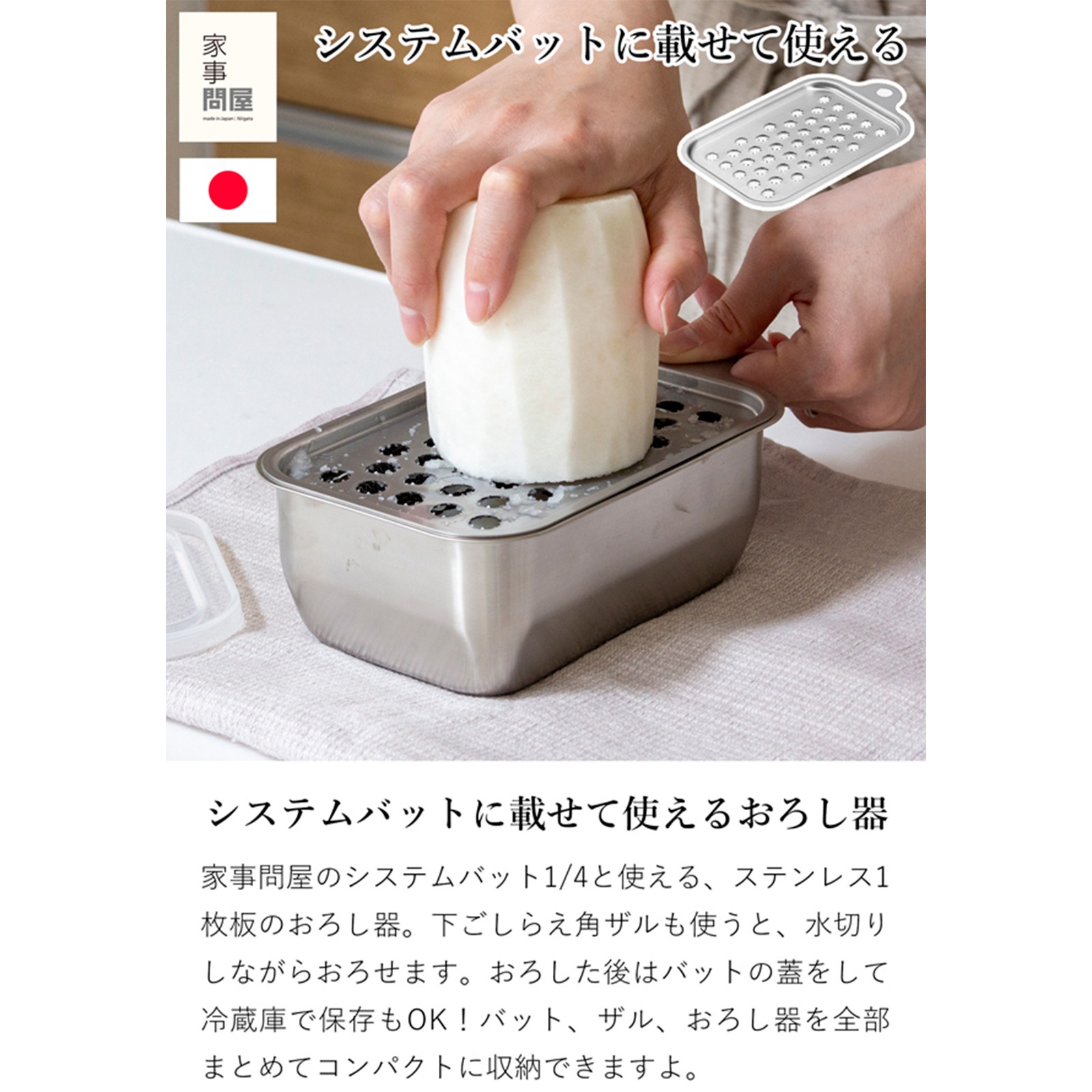 家事問屋のステンレス1枚板のおろし器。システムバット1/4に載せて使え、下ごしらえ角ザル1/4も一緒に使えば水切りしながらおろせます。