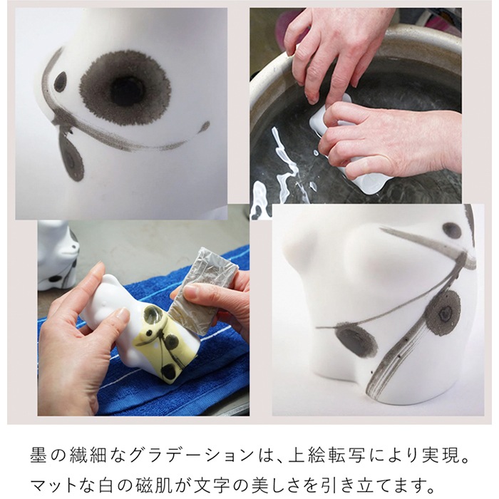 書をモチーフにしたデザインについて教えてください。 書家・中塚翠涛氏が書いた漢字「花」をモチーフに、やま平窯元が図案化・絵付けを行ったコラボレーション作品です。 マットな白磁の質感に、墨の濃淡が美しく映え、まるで書画アートのような佇まいに。 和モダンや静謐な空間にも自然になじむ、アート性の高いmomoco bearです。 有田焼の置物は割れやすくありませんか? 磁器のため強い衝撃にはご注意が必要ですが、日常的に飾っていただく分には問題ありません。 安定感のある形状で、棚や玄関にも安心して置いていただけます。 大きさはどのくらいですか? 両手のひらに収まるほどのサイズ感です。 大きすぎず小さすぎないため、棚の上やデスク、玄関など限られたスペースにも気軽に飾れます。 インテリアのテイストを選びますか? 北欧インテリアや和モダン、シンプル・ミニマルな空間にも自然になじみます。 季節の飾りと一緒に飾れますか? クリスマスリースやお正月飾りなど、季節の小物と合わせても違和感なく楽しめます。 一年を通して飾れるインテリアオブジェです。 一つひとつ表情が違いますか? 職人の手仕事により、色合いや筆跡、風合いには個体差があります。 同じものが二つとない、世界にひとつだけの表情としてお楽しみください。 ギフトとして贈れますか? 箱入りなので出産祝いや誕生日祝い、結婚祝い、新築祝いなど、大切な方への贈り物としてもおすすめです。 世代を問わず長く楽しんでいただけるインテリアです。 |