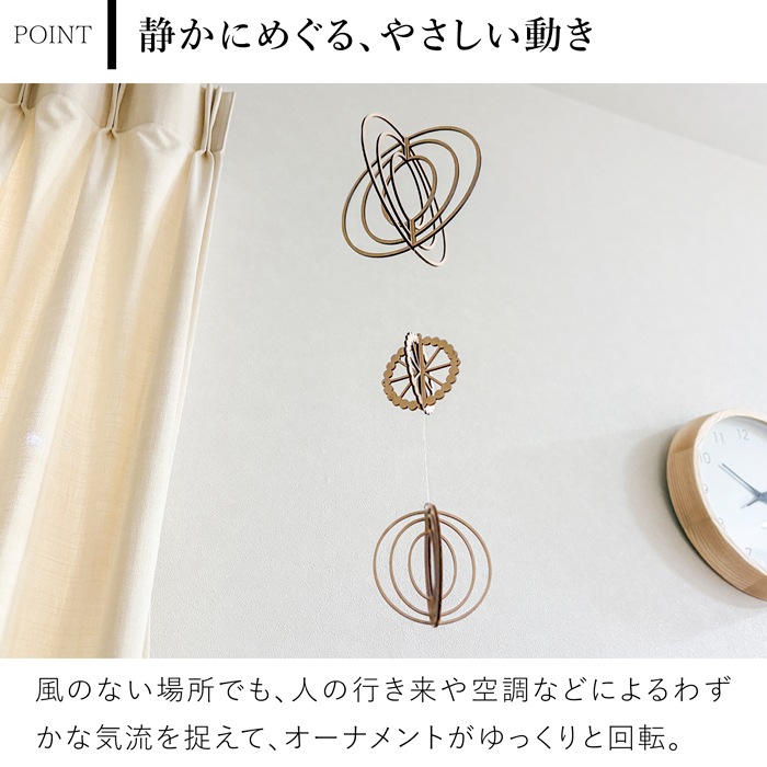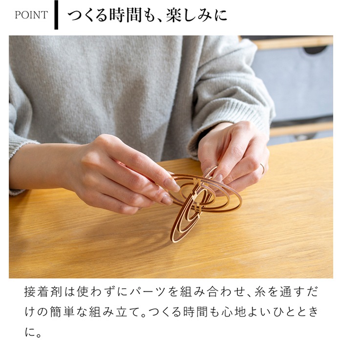 組み立ては難しいですか? 接着剤は不要で、パーツを組み合わせて糸を通すだけの簡単組み立てです。 初めての方でも安心してお作りいただけます。 どのくらいの風で動きますか? 強い風は必要ありません。人の行き来や空調などのわずかな気流でも、ゆっくりと回転します。 一年中飾れますか? 北欧テイストのシンプルなデザインなので、季節を問わずお楽しみいただけます。 クリスマス装飾にもおすすめです。 取り扱いで注意することはありますか? 繊細な作りのため、組み立て時や設置時は強い力を加えないようご注意ください。 また、落下などの衝撃で破損する可能性があります。 |