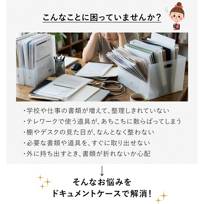 ・大切な書類をきれいな状態で保管したい方 ・書類を持ち運ぶ機会が多い方(仕事・打ち合わせなど) ・耐久性のあるしっかりしたケースを選びたい方 ・デスクまわりをすっきり整えたい方 ・テレワーク用の道具をひとまとめにしたい方 ・見た目にもこだわりたい方(シンプル・上質な収納を探している方) ・必要な分だけ揃えたい方(単品で購入したい方) |