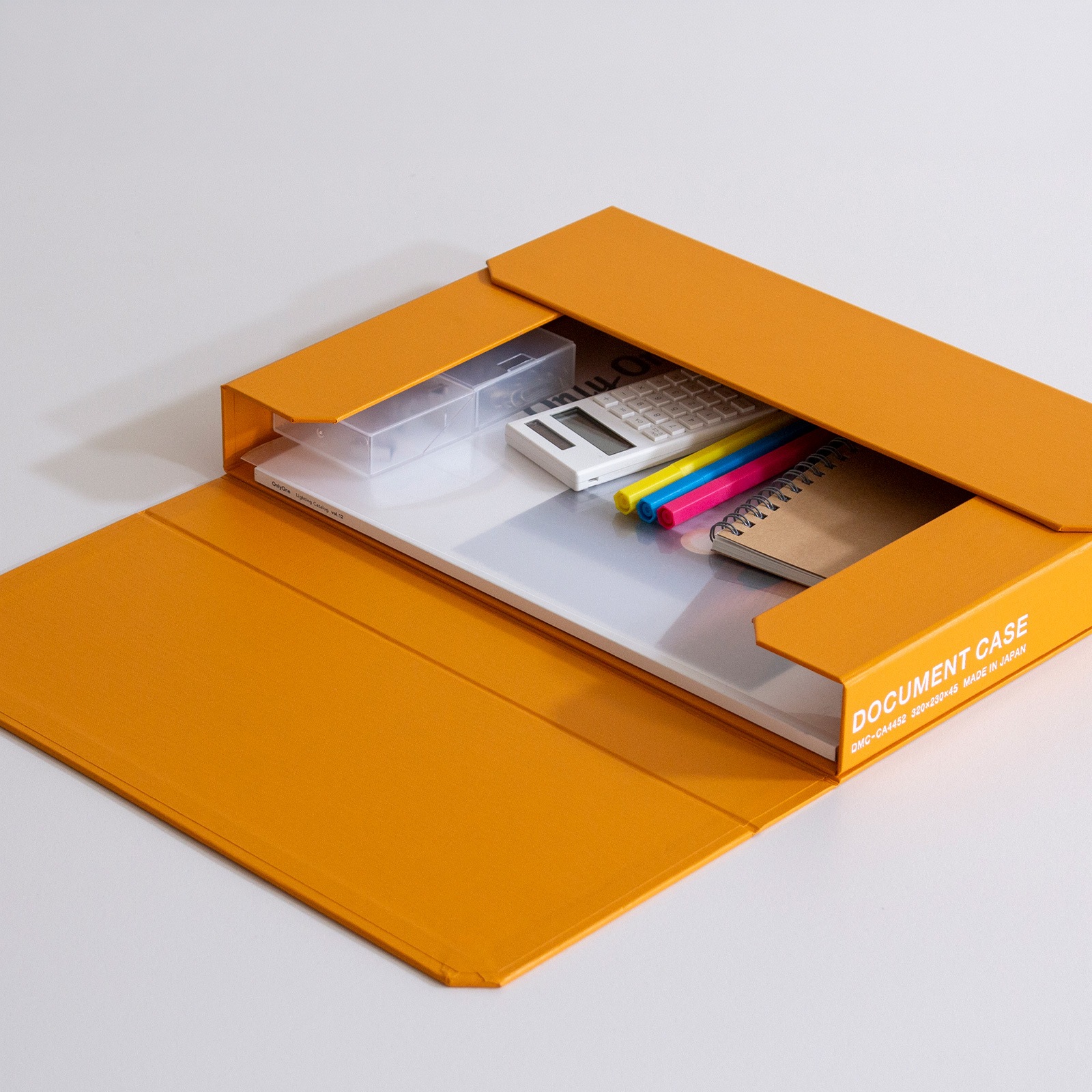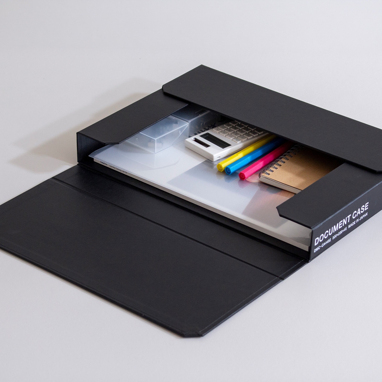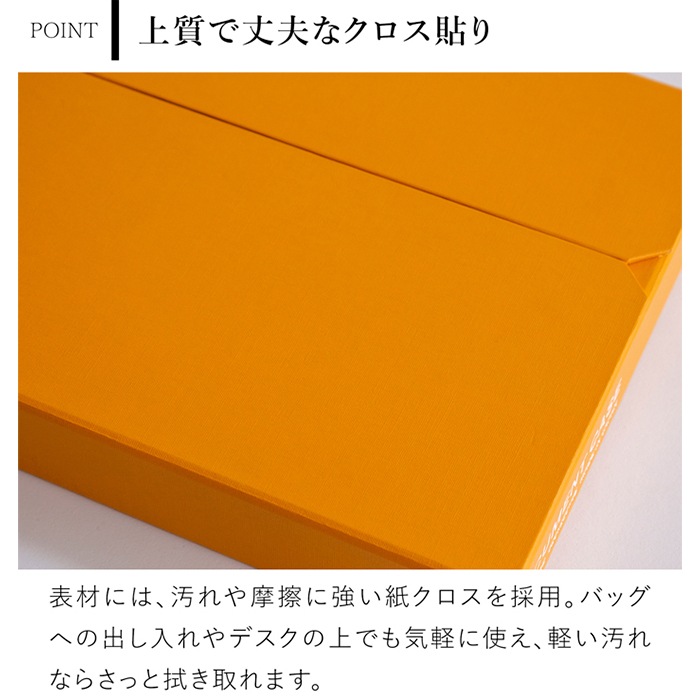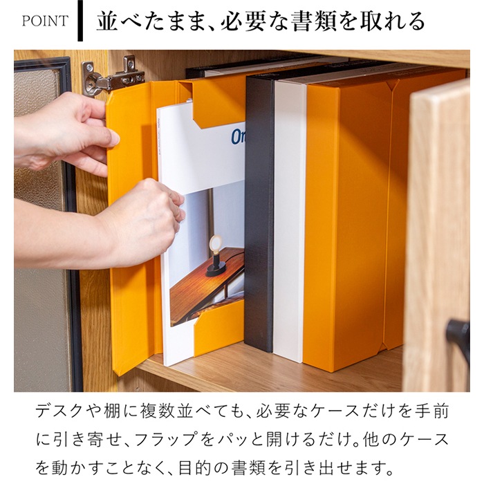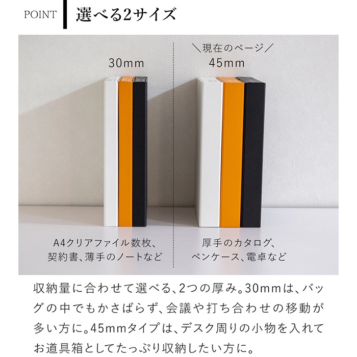 A4サイズの書類はそのまま入りますか? A4クリアファイルごと収納できるサイズです。 どのくらいの収納量がありますか? 30mm・45mmの2サイズがあり、書類の量や用途に合わせてお選びいただけます。 45mmは厚手のカタログ、筆記用具、電卓などにおすすめです。 持ち運びにも向いていますか? クロス貼り仕様で耐久性があり、書類の折れや汚れを防ぎながら持ち運びできます。 開閉はしやすいですか? マグネット式のため、簡単に開閉できスムーズに書類の出し入れが可能です。 汚れた場合はどうすればいいですか? コーティングペーパー仕様のため、軽い汚れであればさっと拭き取ることができます。 自立しますか? しっかりとしたつくりなので、棚やデスクに立てて収納いただけます。 |