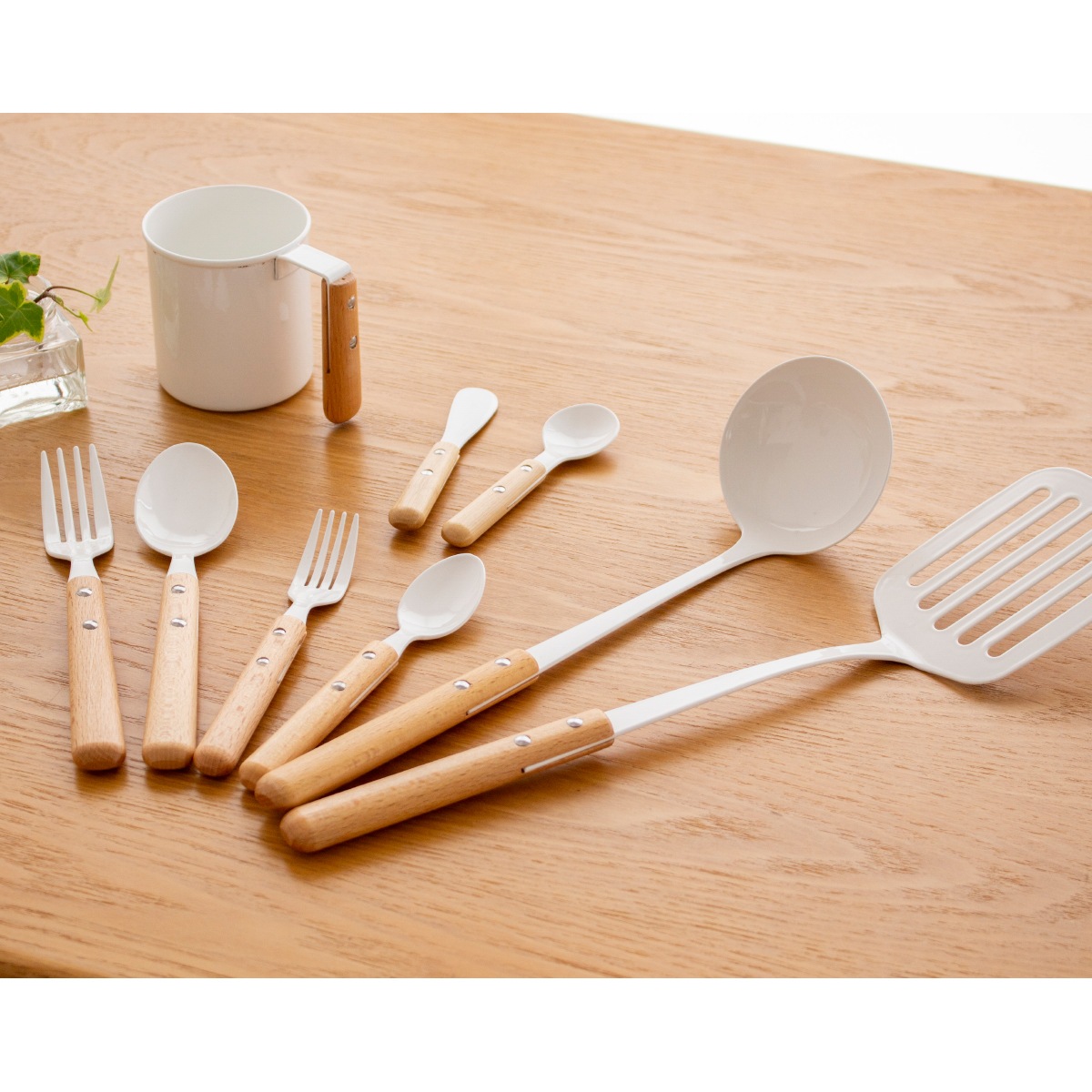 琺瑯の白×木製ハンドルの組み合わせが